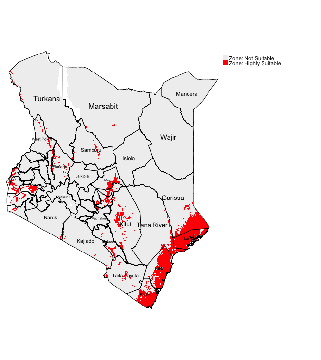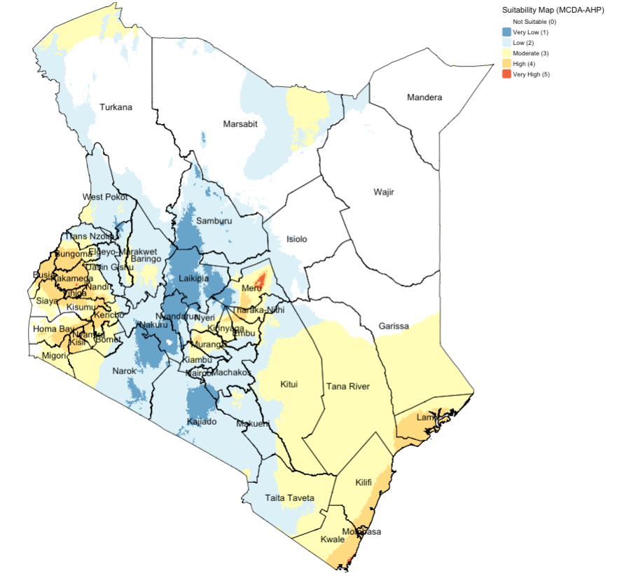 Areas with high suitability for mosquito occupancy based on the optimal conditions (from selected environmental variables and constrained on aridity) are locations in the far south-east region, small pockets in the central region, and far into the deep-west region of Kenya.