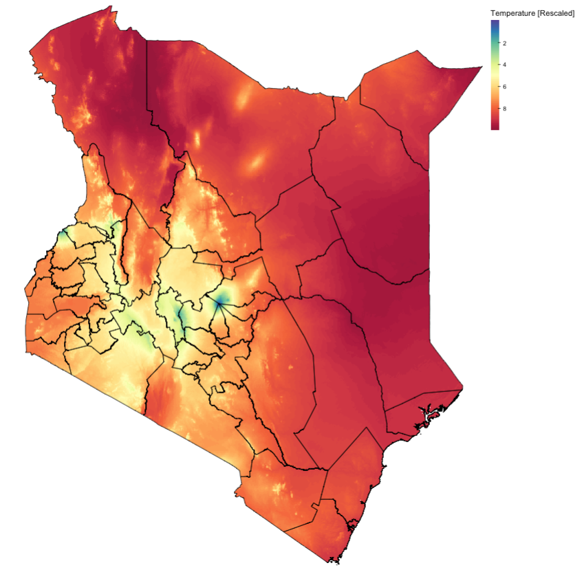 - Raster: Mean Temperature in Kenya (1000m resolution) named