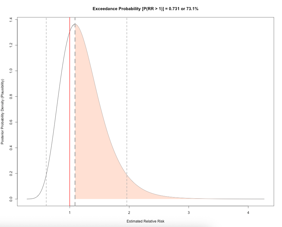analysis_cross_data$ExceedProb <- round(analysis_cross_data$ExceedProb, 3)For the exceedance probabilities, usually, we are interested in computing the probability of an area generally having an increased risk of a particular outcome. Here, we have set q = 1.00 to compute P(RR > 1.00) for a given area.