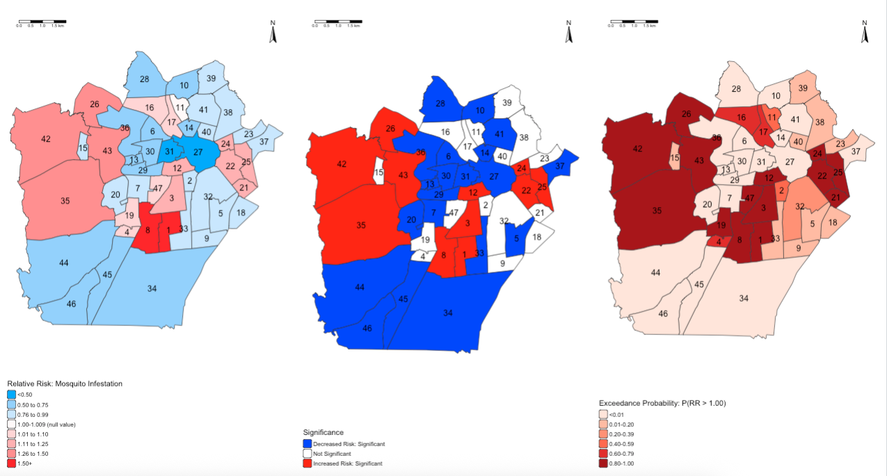 INTERPRETATION: The following adjacent neighbourhoods i.e., 1-3-8-12; 26-35-42-43; and 22-24-25, are neighbourhoods with households which are at high risk of mosquito infestation given the levels of temperature, precipitation and degree of urbanisation within those areas. This increased risk is statistically significant, which high-levels of certainty based on the exceedance probabilities being somewhere around 80-100%.
