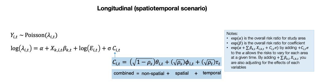 id_timeWe can pass the spatial temporal in inla() function to get our overall and area-specific risk estimates accordingly: