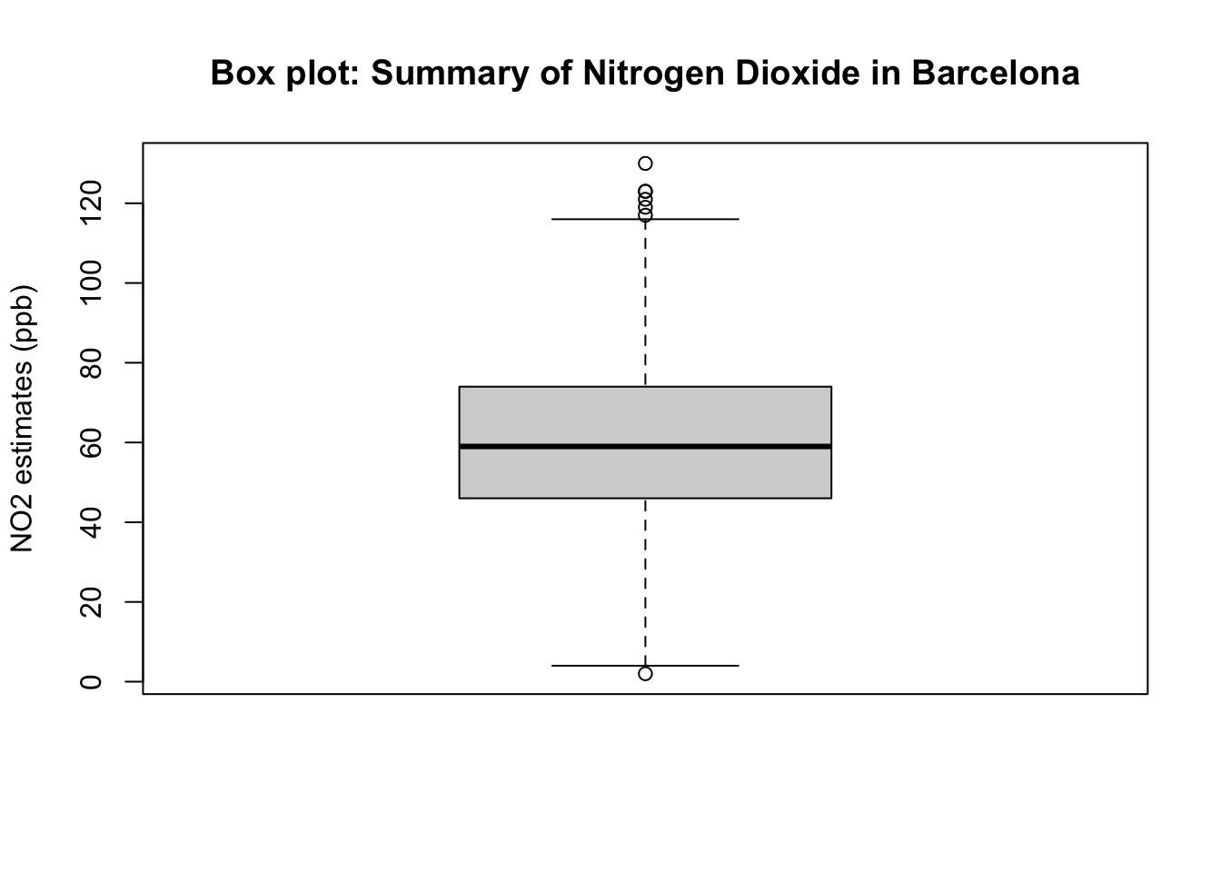 The standard deviation is ± 20.61pbb – this is the error around the mean of NO\(_2\) i.e., estimated as 59.69ppb. To visualise the distribution of a continuous variable – your ‘go-to’ plot is a boxplot. You can use the function boxplot() to generate one. Type the following to churn it: