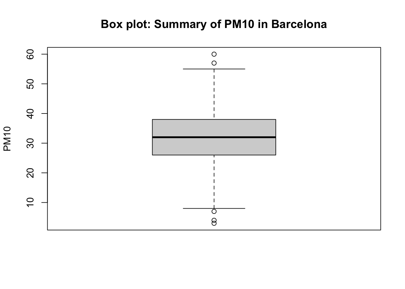 boxplot(air_quality_data$PM10_est, ylab = "PM10", main="Box plot: Summary of PM10 in Barcelona")