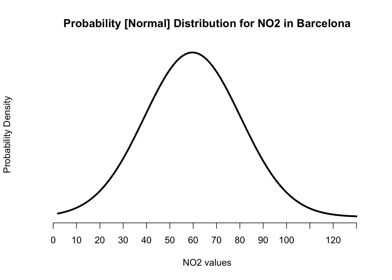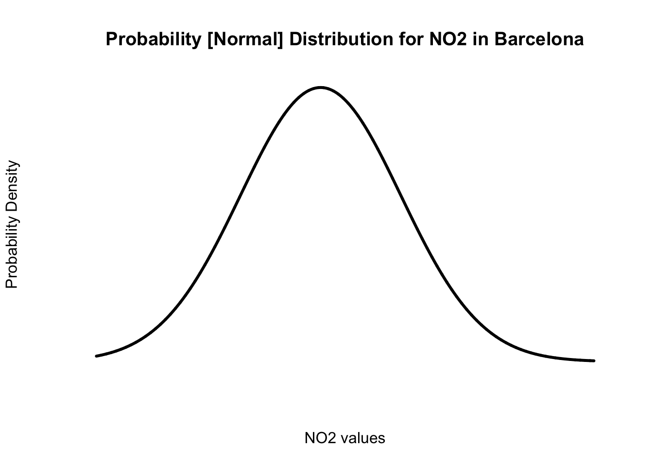 Now that we have the key ingredients to visualise our probability distribution for the NO\(_2\) values in Barcelona. We can proceed to create our graph from scratch. We start with using the plot() and applying the labels.