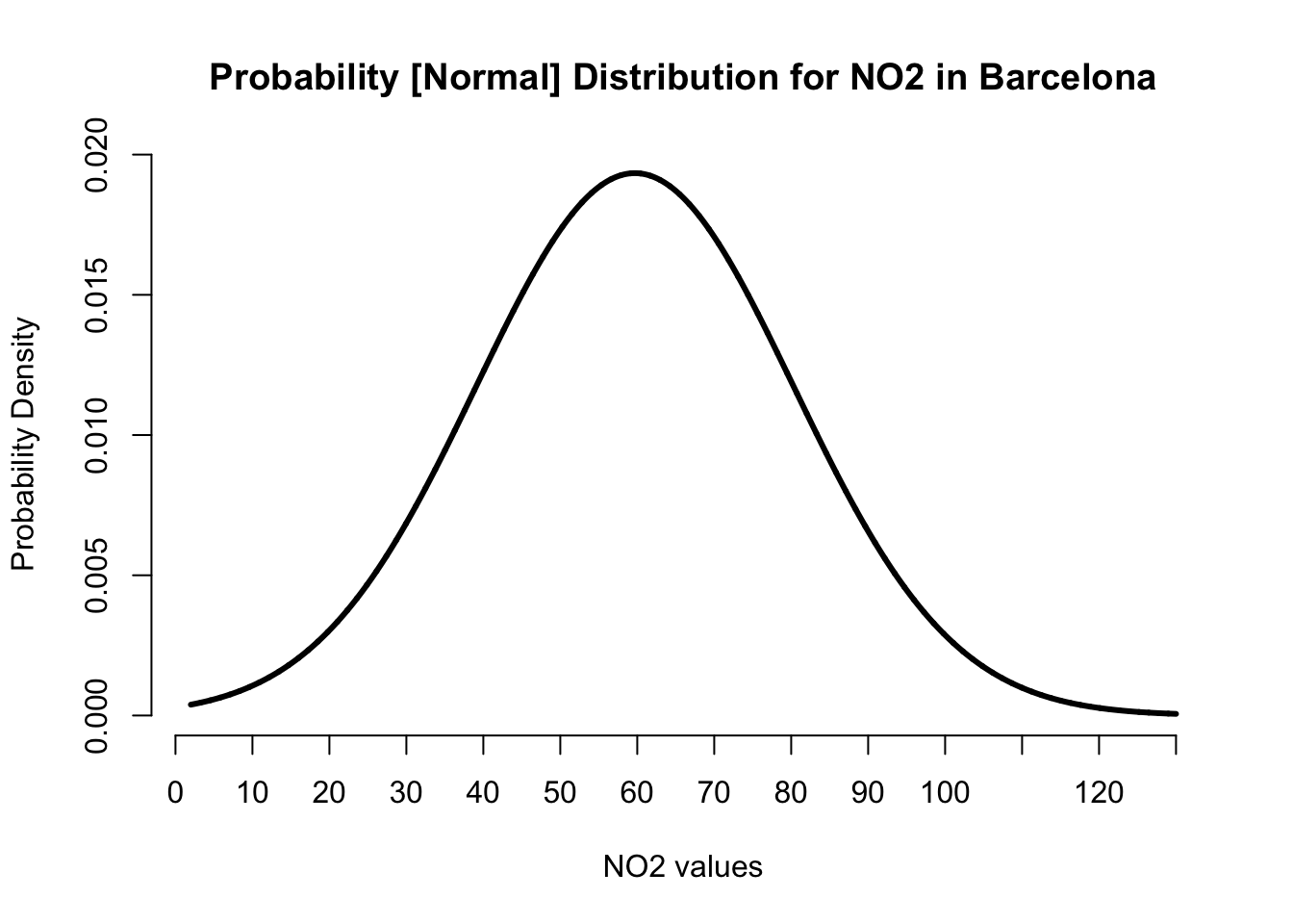 From the above graph - the image shows that for each value of NO\(_2\) along the x-axis corresponds to some probability density estimate on the y-axis. For instance, the probability density for NO\(_2\) levels being exactly equal to 63ppb is 0.01911 (1.911%); and for an example, the probability density for NO\(_2\) levels being exactly equal to 80ppb is 0.01191 (1.1191%) etc.