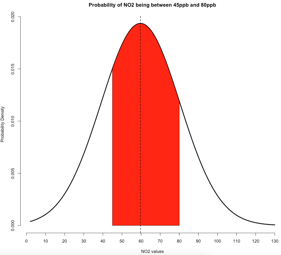 We get 0.5993516 or 59.93516%. So we have therefore predicted that there’s a 59.93% chance that air concentrations of NO\(_2\) levels in Barcelona fall between 45ppb and 80ppb. Again, note that the code for generating the above plot for this scenario is shown below. It builds on that custom plot code we made earlier: