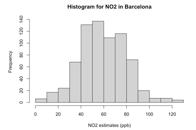 Frequency distribution and table for ambient NO\(_2\) levels in Barcelona, which told us how often a particular measure for NO\(_2\) was observed. For instance, we found that in Barcelona, the common measure for ambient NO\(_2\) were values that fell in the range of 50-60ppb that accounted for
