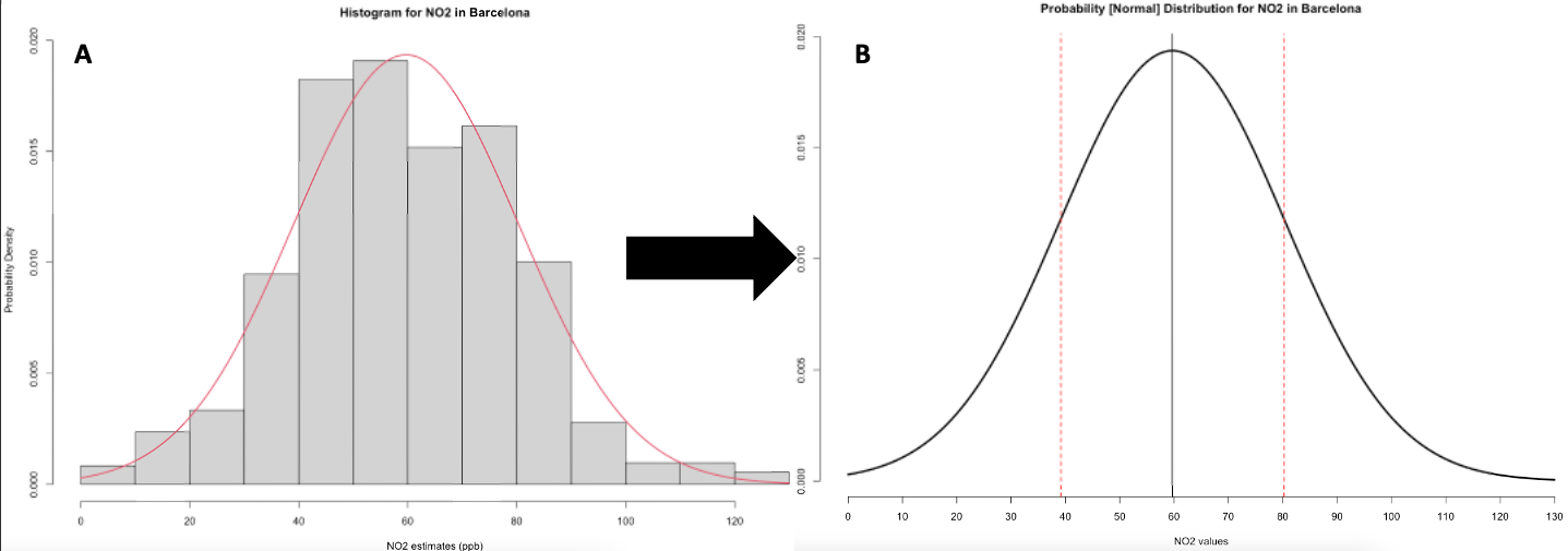 Sometimes, we can be in a situation where we are dealing with a data science problem but do not have any data at our disposal. But with probability distributions, we can do a work around if have prior knowledge or prior information of the problem. For instance, it is possible for us to generate a theoretical distribution for these NO\(_2\) values based on our knowledge of its mean and standard deviation with the assumption that its bell-shaped in the first place as shown in image [B]. This curve will show us the probability of observing every single possible value for the NO\(_2\) in Barcelona, as well as simulate a similar dataset.