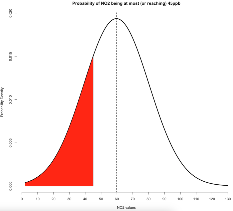 main = "Probability of NO2 being at most (or reaching) 45ppb",