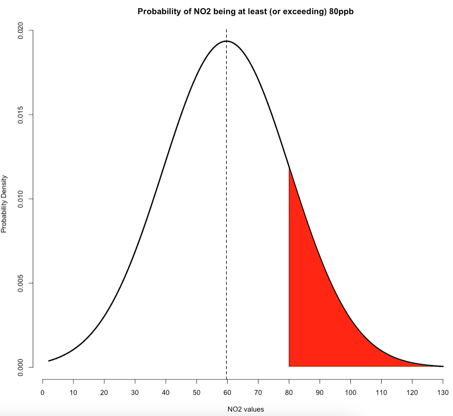 We get 0.1612494 or 16.12494%. So we have therefore predicted that there’s a 16.12% chance that air concentrations of NO\(_2\) levels in Barcelona exceeds 80ppb. Again, note that the code for generating the above plot for this scenario is shown below. It builds on that custom plot code we made earlier: