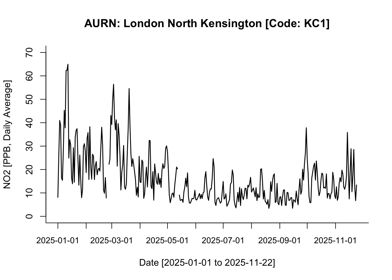 We can extract information into a data frame by using the importAURN() function. Let us pull the record available records in 2025: