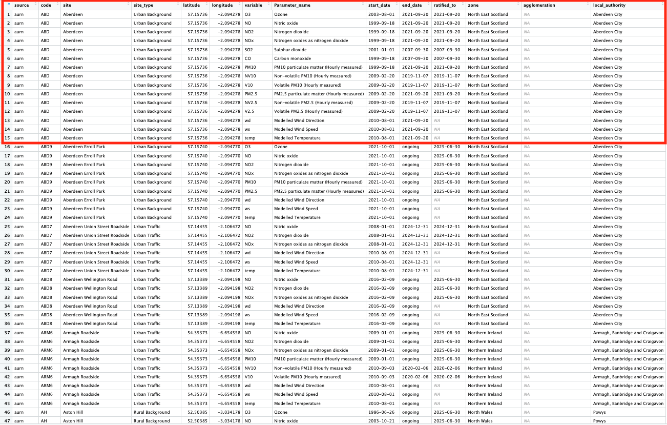 View(all_airpollution_aurn)This shows details of what each air pollution monitor station in the UK is measuring - let us examine the image closely: