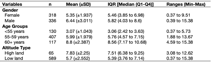 7 low land 589 5.7 (±2.552) 5.39 (3.76 to 7.14) 0.37 to 15.38
