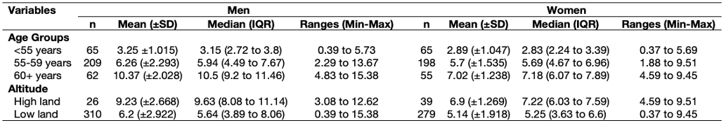 5 low land 310 6.2 (±2.922) 5.64 (3.89 to 8.06) 0.39 to 15.38 279 5.14 (±1.918) 5.25 (3.63 to 6.6) 0.37 to 9.45